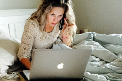 Avelyn, unbeknownst to me, snapped this photo one day, of my working from our home office (aka: my chronically unmade bed), talking to a client.