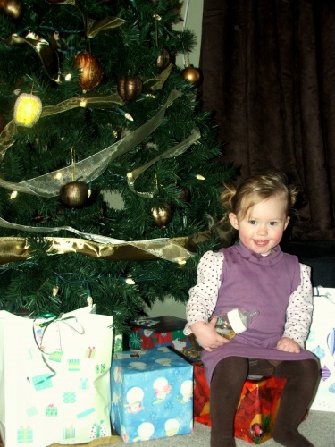 Today Avelyn mastered the art of posing for the camera. She perched atop a present, smiled and cried, “Cheese!” while flashing the crotch of her threadbare tights. She’s going to give Britney a run for her money.