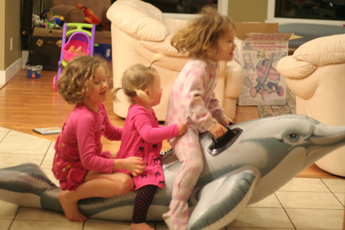 We have exhausted all of the usual indoor activities: colouring, painting, play-dohing, dancing, hitting. So naturally, it was time to bust out the inflatable dolphin and let the girls have their way with it.