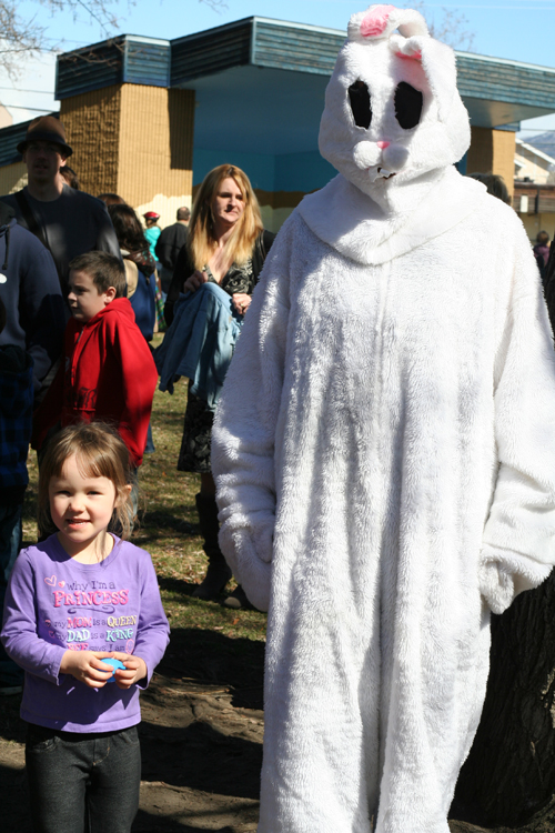 Our cute little town hosted its first annual Easter Egg Hunt this weekend. They were expecting about 100 folks to show up, but the crowds topped out at over 500. In short, it was mayhem. No one knew what was going on, there was a creepy bunny in a crane dropping plastic eggs from the sky, the line-ups for face painting and attractions were miles long. So, we got our obligatory photo with the skeeviest Easter Bunny ever and started to walk back to the car.