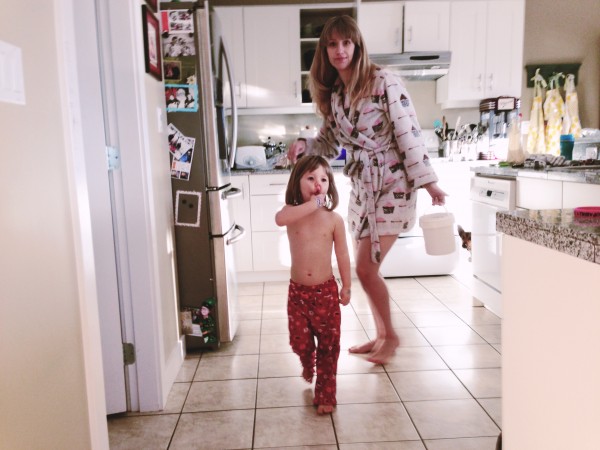 Karenna snapped this photo today, capturing the blur of the morning. Kids running amok, half-clothed, getting out of jammies and refusing to put on actual outfits fit for public, me with pouffy bedhead and my trusty cupcake robe, a huge vat of honey for toast dangling from my hand, dishes strewn all over the counters, and a dog peeking around the corner.