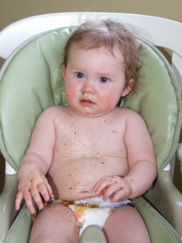 And here is the “after” shot of dinner. Hamburger Helper makes a great meal (not really, but that’s how the jingle goes, right?) and an even greater mess. I love her puzzled expression,as though she’s saying, “I am covered in chunks and I am pretty sure there’s ground beef in my bum crack. A little help here?”