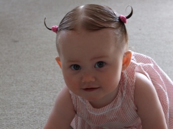 Her first pigtails. I think all that’s held in each elastic is a foot-long sideburn that has been raked up the side of her head and pinned in place.